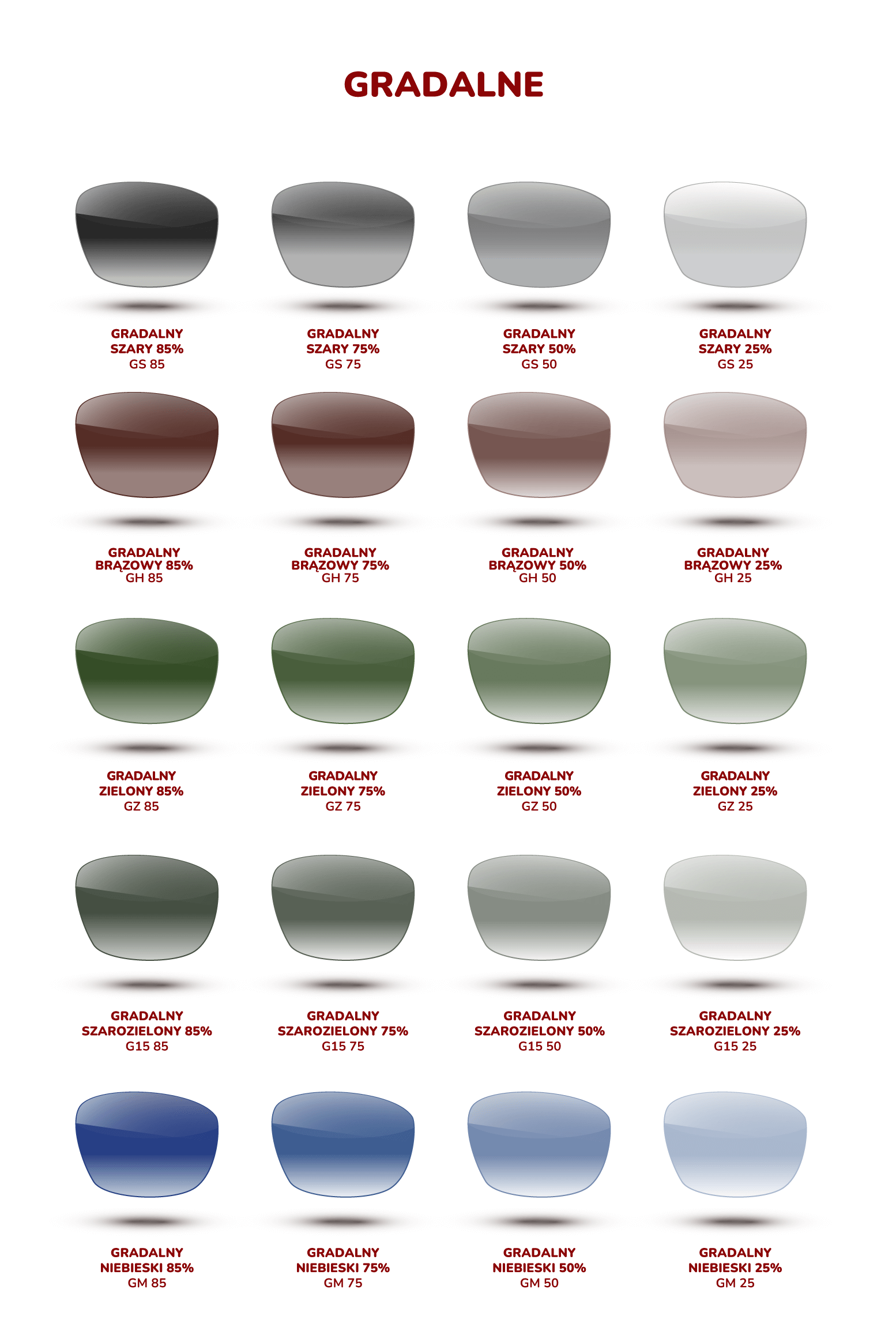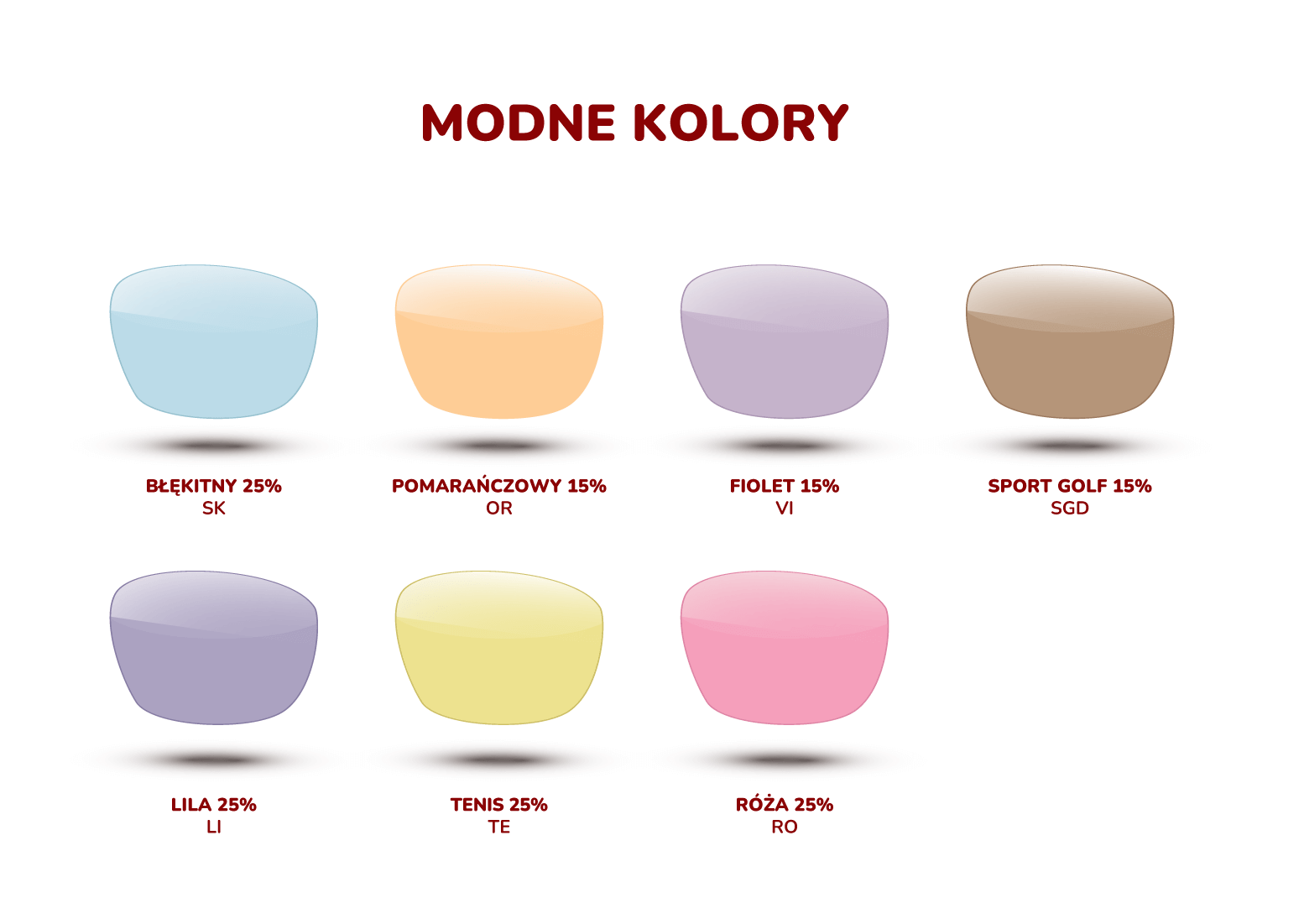 Barwienia soczewek różnią się nie tylko wizualnie, ale także zapewniają różne korzyści, ponieważ każdy kolor soczewki gwarantuje inny poziom kontrastu. Nasza oferta obejmuje 47 modeli barwienia wykonywanych w trzech wariantach: